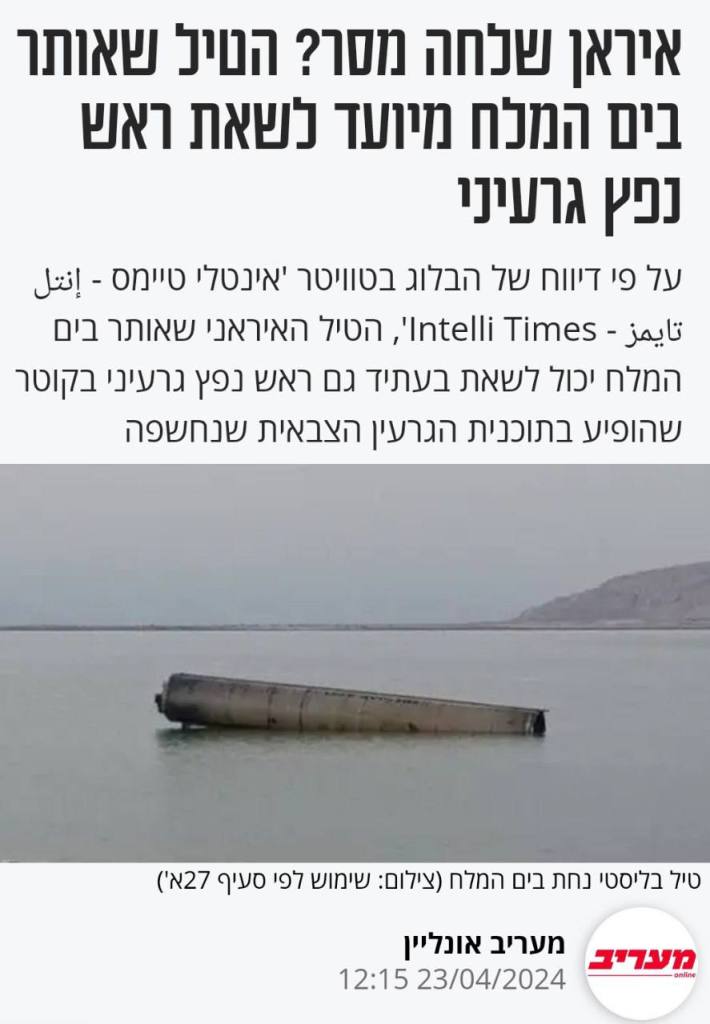 Lastly, Israelis seem convinced that IRGC was sending a message regarding its nuclear capability. A booster from a missile that was used in the successful Iranian raid of 13-14 April fell (conveniently?) into the Dead Sea (see image above). It is of the type that ‘may in the future carry a nuclear warhead,’ i.e., it has the appropriate specifications to deliver a nuclear warhead. This was confirmed for me on 23 April by an Iranian ballistic missile specialist. Thus, IRGC has the means of delivery; IRGC only needs the correct ‘cap’ to fit on top of the missile.