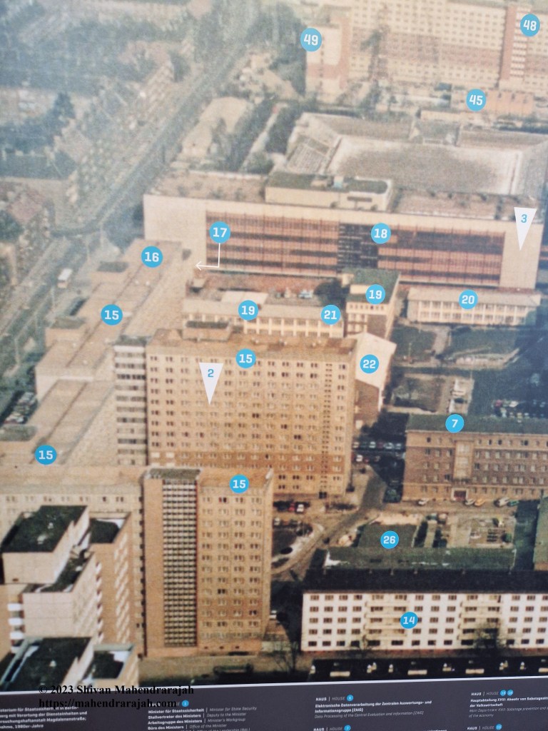 The site of the Stasi HQ in Lichtenberg, East Berlin, includes the Stasi Museum, archive, “Campus for Democracy”and sealed buildings. The map below should orientate general readers. The site is huge. Building No. 1 (Museum) is open to the general public. The museum’s contents are banal (as are the tours offered in English and German to unsuspecting tourists), and hold mostly shlock to entertain tourists. The focus of the museum, not surprisingly, is on Stasi’s domestic spying. HVA’s buildings are closed; and artifacts, and documents of interest to historians of Cold War espionage are controlled by the German Federal Archives.[4] When I last visited the Normannenstraße site (2023), I got the sense the towers, especially those that had housed HVA, were headed for conversion to apartments.