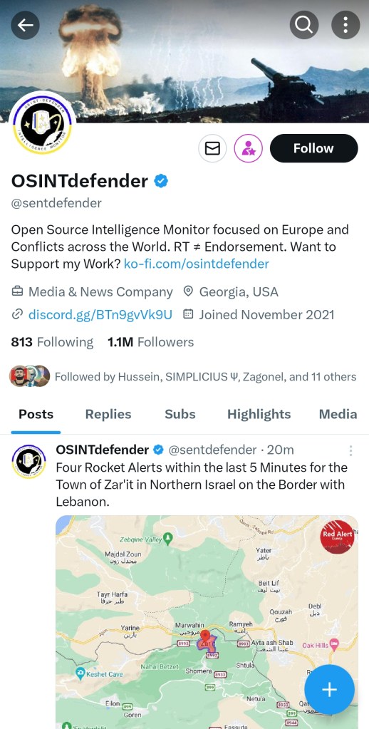 OSINTDefender is a stellar example of the OSINT Epidemic. The account is run by a child living in his mama’s basement in Georgia (the U.S. state). This child cannot even properly capitalize words in a sentence, but he has 1.1 mil. followers. He purports expertise on the Ukraine-Russia War; and since October 7th, has become a self-anointed expert on the Israel-Palestine conflict. He earns from reader tips—and possibly other sources (e.g, the U.S. Government). He supplies misinformation, as Matthew Gault of Vice magazine demonstrated in “Verified Twitter Accounts Spread Misinfo About Imminent Nuclear Strike.” OSINTDefender faithfully follows the U.S. Gov’s “party line”: Russia bad; Ukraine good. Putin awful; Zelensky great. Russia losing; Ukraine winning. The formula extends to Israel: Palestinians bad; Israelis good. Israel good; Iran rotten. You get the drift. But this is what his readers—and possibly his governmental paymasters—expect from him.
