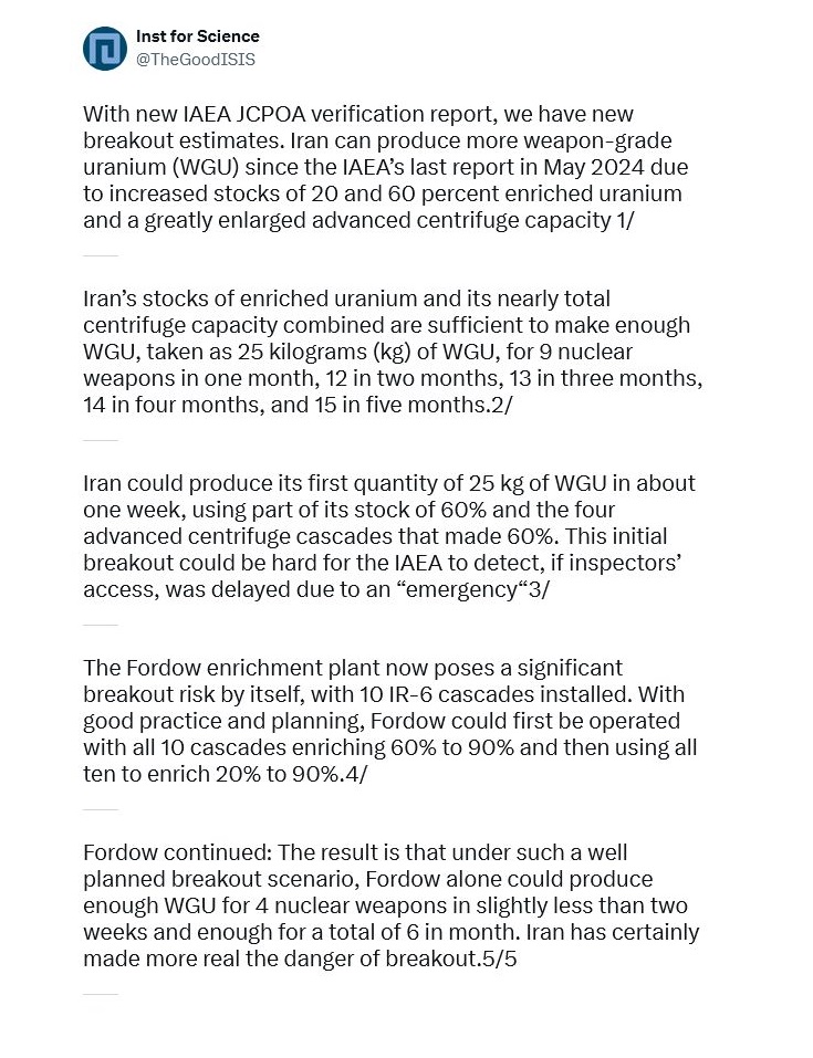 Iran is not being cowed or deterred. Khamenei is merely playing for time until he can achieve nuclear weapons status. We are well past the point of no return. No amount of money, sanctions-relief or delay will prevent Iran from becoming a nuclear power. The Hill, 29 August 2024