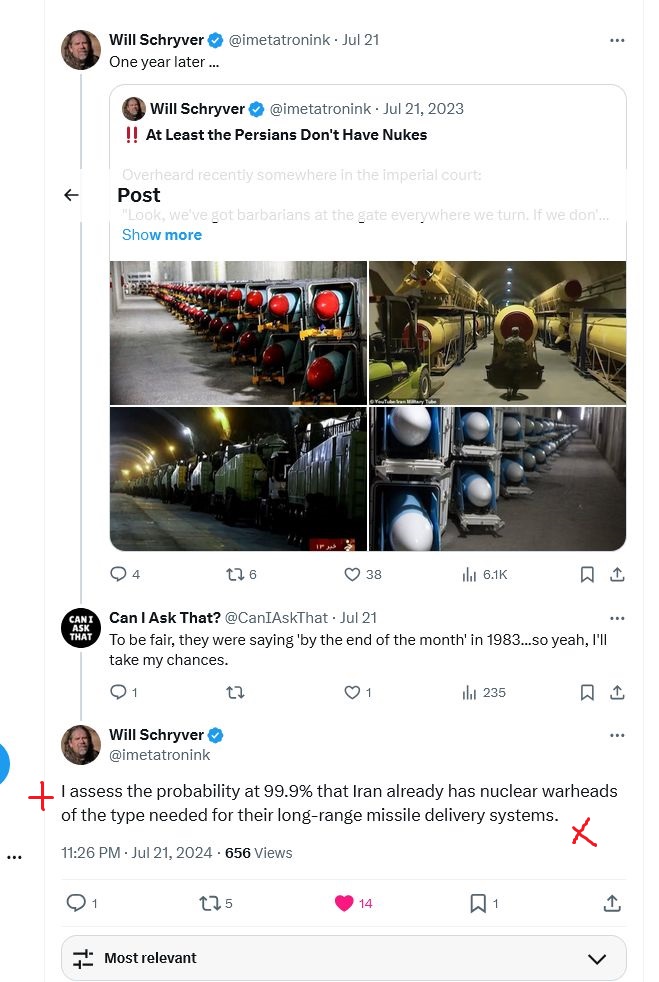 In my April 2024 essay, “Iran: Crossing the Nuclear Rubicon,” I stated that Iran has probably developed nuclear devices. I am not alone in this assessment (see Tweet by William Schryver). Given Israel’s size, Iran does not need to develop many nuclear devices: one for testing—to demonstrate Iran’s membership in the “nuclear club”—and two to three to use should Israel first strike Iranian facilities with tactical nuclear weapons, or Iranian cities with strategic nuclear weapons. Moreover, 90% highly-enriched uranium (HEU = WGU) is not essential for a nuclear bomb: 60% HEU, of which Iran has sufficient quantities, is weapons-grade; 60% HEU makes for a smaller “bang” and crater. IRGC Aerospace possesses the ballistic missiles to deliver nuclear warheads.