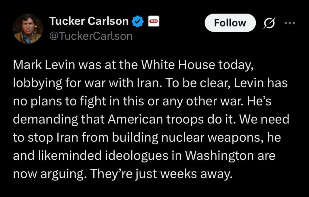 If Israel does succeed in dragging the U.S. into war with Iran, conservative hostility towards Israel will explode. As Tucker notes, “a war with Iran would amount to a profound betrayal of his [Trump’s] voters. It would end his presidency.” It will also lead to civil strife in the U.S. and an increase in anti-semitism. But American-Israeli agitators like Mark Levin, ADL, and AIPAC do not care about these consequences. They are hell-bent on igniting the Iran War.
