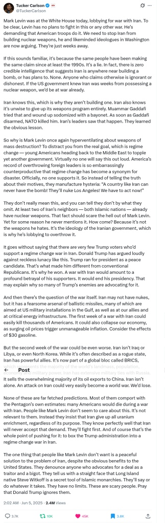 The title, obviously, is in jest. I say little here other than to post videos and tweets by conservatives. Tucker Carlson’s tweet of 5 June 2025, for example, is accurate, and reflects mainstream conservative views that Israel hoodwinked the U.S. into the Iraq War. He is correct that Israel is not anxious about Iran’s nuclear program, but is seeking regime change in Iran, which is what I have argued. Tucker’s tweet, and a droll but accurate rendering by Grok of his tweet, are below. (Update, 8 June 2025: see “Tucker Carlson Is Right About Iran and Mark Levin,” The American Conservative, 7 June 2025).
