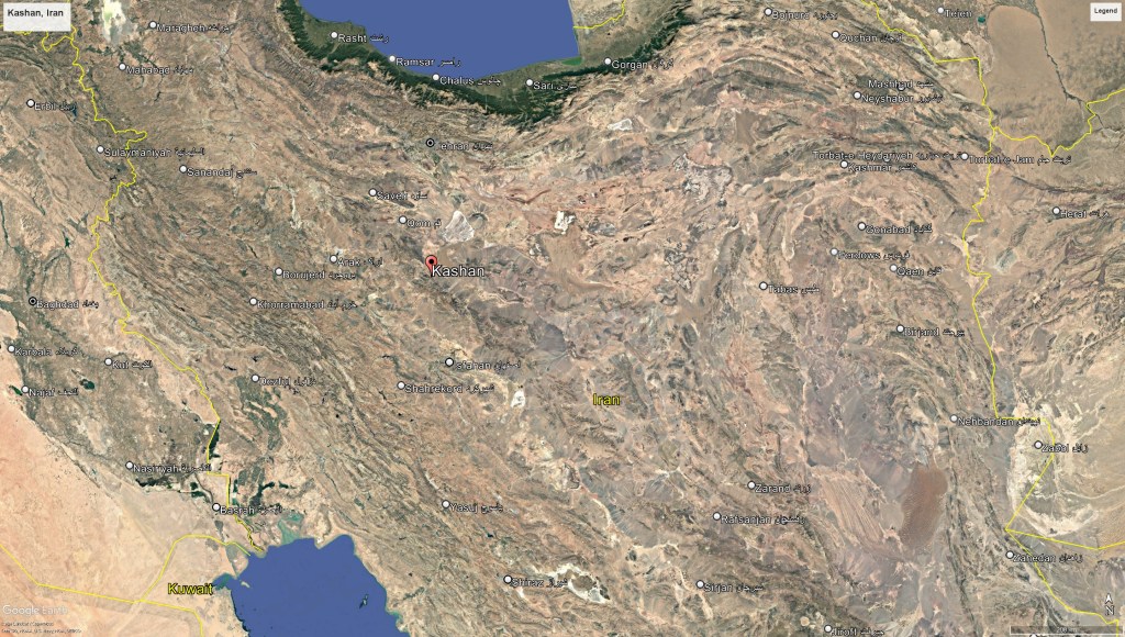 Kashan (33° 59ʹ 30ʹʹ N, 51° 27ʹ 00ʹʹ E; elev. 950m) is ca. 260km south of Tehran (see map). It is an ancient city, as attested by fifth millennia BC ruins, with life continuing to be recorded in the vicinity to the first millennium BC. Kashan’s efflorescence began in the Islamic era. Encyclopaedia Iranica (EI; throughout), explicates Kashan’s and greater Kashan’s “History to the Pahlavi Period” (i.e., to the Iranian Revolution), with entries for the region’s geography and historical geography.